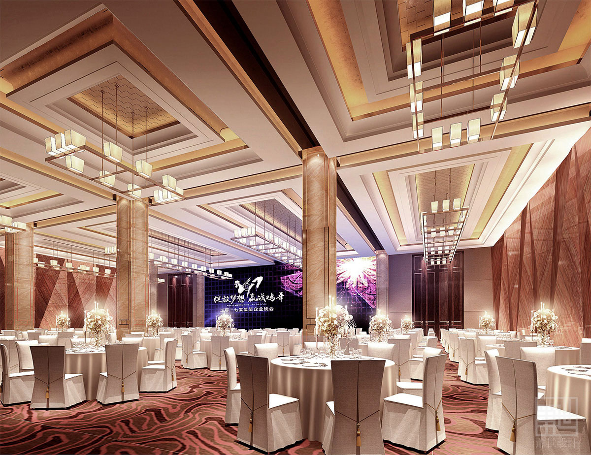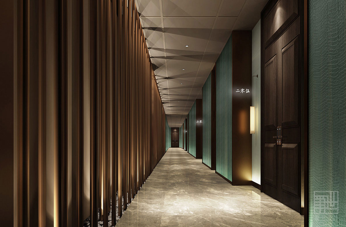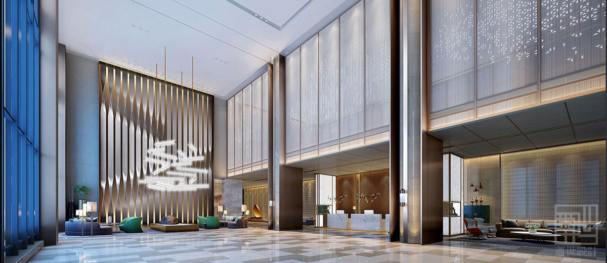 在整個(gè)酒店設(shè)計(jì)中有以折紙藝術(shù)為設(shè)計(jì)線索,在大堂、前廳、走廊、洗手間等空間都能看到折紙的元素。另外值得一提的便是這室內(nèi)區(qū)域的立面設(shè)計(jì),如果按照原來的半弧形曲線的形狀,立面效果勢必被平面化,也不能與外部空間有機(jī)結(jié)合,所以我們以退為進(jìn)將弧線轉(zhuǎn)化成折線,這樣一來就能讓原來平淡的立面變得多變且富有韻律感。當(dāng)然,在施工的過程中也遇到了很多困難,比如:地面大理石與銅管密度存在差異造成了地面發(fā)黑和平整度不夠。還有原木的尺寸加工與現(xiàn)場尺寸不吻合造成安裝困難。再有天花藝術(shù)造型遮擋了消防噴淋等等諸多問題。當(dāng)然有時(shí)候現(xiàn)場出現(xiàn)的問題是難以預(yù)見的,但這也是設(shè)計(jì)的魅力所在,現(xiàn)場的突發(fā)事件更能讓我們?cè)鲩L臨時(shí)處理問題的能力,更能增長我們的設(shè)計(jì)熱情,對(duì)于我們每一個(gè)項(xiàng)目都是一個(gè)全新的課題,每一個(gè)案例都是獨(dú)一無二的。