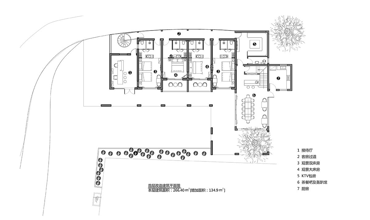 加建部分建筑增加配套用房空間,為了公共空間與客房私密空間提供過(guò)渡,設(shè)計(jì)師把客房過(guò)道設(shè)在屋后,在屋前外圍加建了陽(yáng)光連廊,最大限度控制人流來(lái)往帶來(lái)的影響。在尊重自然環(huán)境的前提下,設(shè)計(jì)師把原有前坪的大樹保留,把大樹融入到陽(yáng)光廊道,讓建筑與周邊環(huán)境更融合。