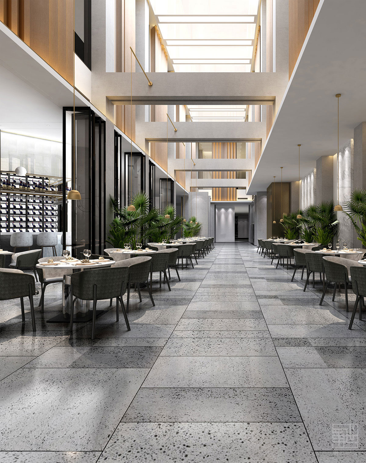 整體的設(shè)計思路十分清晰:由大量的細節(jié)共同構(gòu)成一個統(tǒng)一而完整的項目。酒店的特色之一在于構(gòu)造類似森林的共享中庭空間,掏空了一部分的體量,從而形成一個賦予了公共功能的貫通空間。貫通空間融合了交通流線元素和植被樹木等自然元素。
