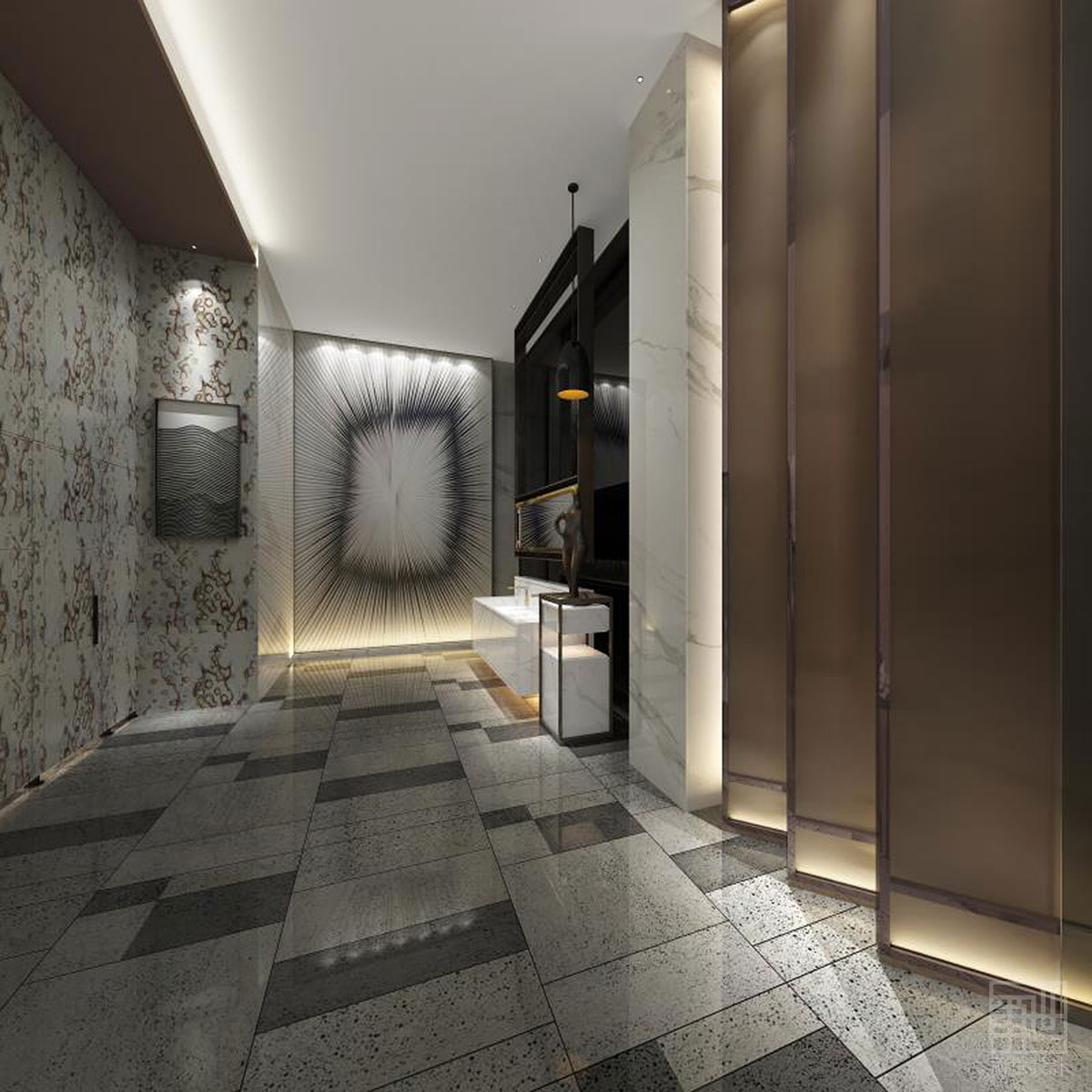 新藝術(shù)風(fēng)格的永恒性以抽象的形式在室內(nèi)空間中體現(xiàn)出來。簡練的細節(jié)反復(fù)出現(xiàn),貫穿了建筑的始終。酒店內(nèi)的家具大都擺放得十分隨意,優(yōu)雅而簡約的布面材料更突顯了舒適的氛圍。在公共區(qū)域,明亮的大理石地面為空間賦予了統(tǒng)一和流暢的體驗。